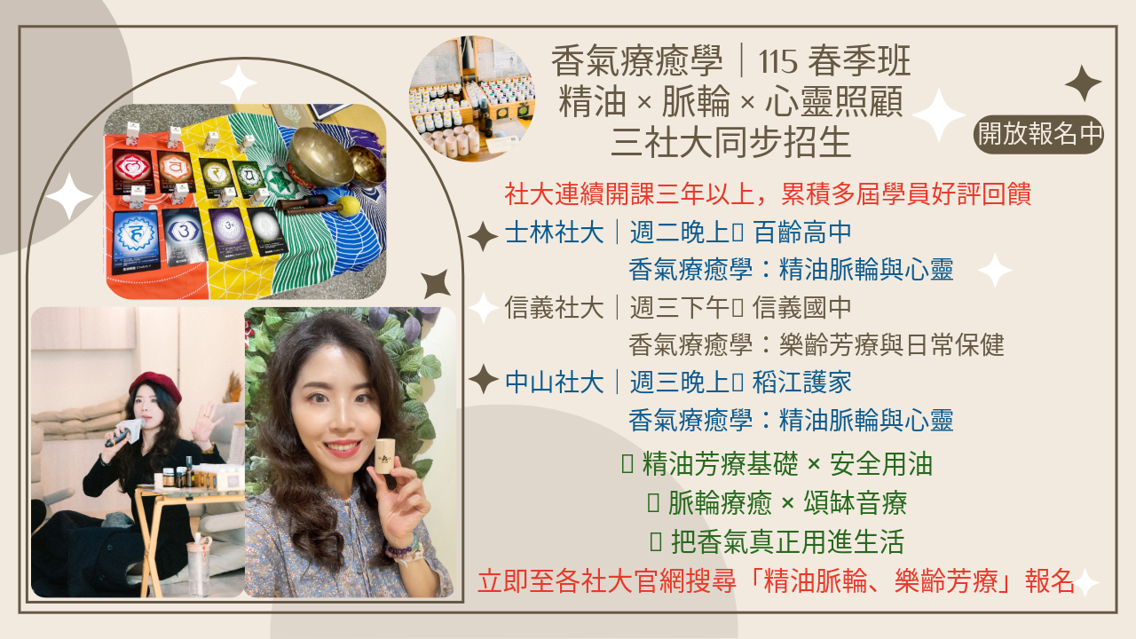 香氣療癒學|精油 × 脈輪 × 心靈,陪你把療癒帶回日常生活,115 春季班 中山・信義・士林社大同步招生中,社大連續開課三年以上,累積大量學員好評回饋,等你來加入